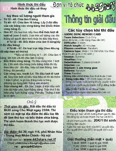 Hòa nhịp cùng trái bóng tròn sôi động, góp phần tạo 1 sân chơi lành mạnh cho những người hâm mộ môn thể thao vua,442stars   tiếp tục tổ chức giải Hanoi Open Cup lần thứ 2 vào ngày Chủ Nhật 23/04 tại số 20 - ngõ 116 phố Nhân Hòa - Trung Hòa Nhân Chính - Hà nội. Hy vọng giải lần thứ 2 sẽ quy mô hơn, chất lượng hơn, và sẽ là nơi để các Game thủ môn túc cầu khẳng định mình.
