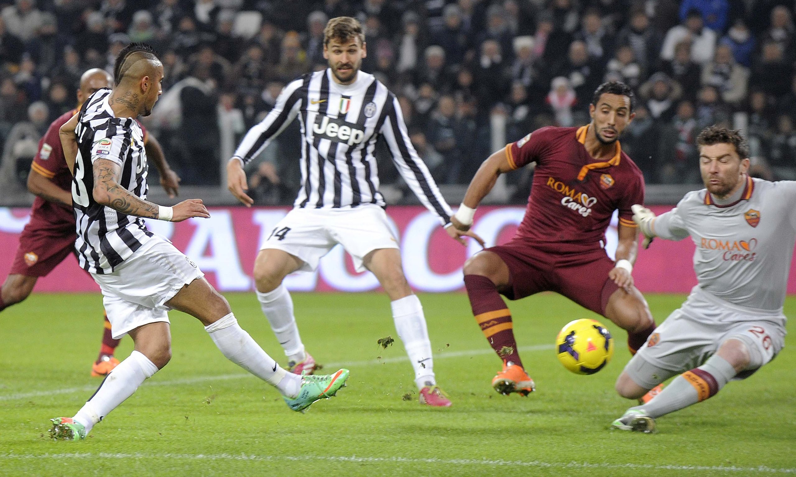 Bên phía Roma không có nhiều bất ngờ về đội hình khi họ đang gặp bão chấn thương. Totti, Gervinho và Iturbe là mũi đinh ba ngược trên hàng công. Và họ sử dụng sự linh hoạt của Iturbe và Gervinho để kéo dãn và làm rối loạn hàng thủ Juve. Gervinho và Iturbe liên tục hoán đổi vị trí buộc các hậu vệ của Juve phải thay đổi liên tục đối sách và tạo ra khá nhiều khoảng trống cho Totti. Roma không chủ trương « khóa » Juve mà tập chung vào lối chơi của mình.