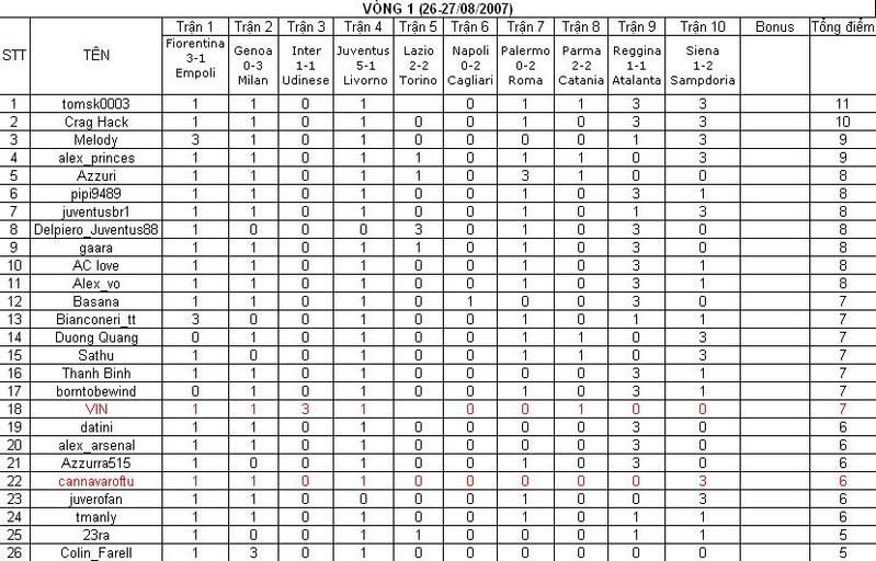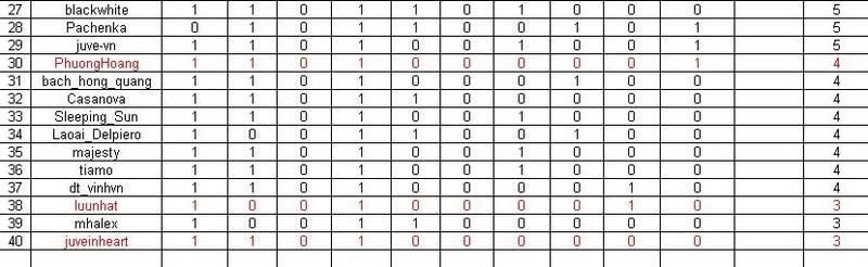 Những đồng chí có mầu đỏ là chưa đăng ký tham gia hoặc đăng ký tham gia sau khi vòng 1 kết thúc. Tạm thời để trên BXH thôi nhá. Để BTC xem xét lại.