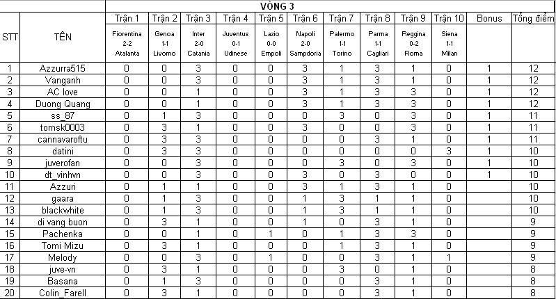 BXH sau vòng 3