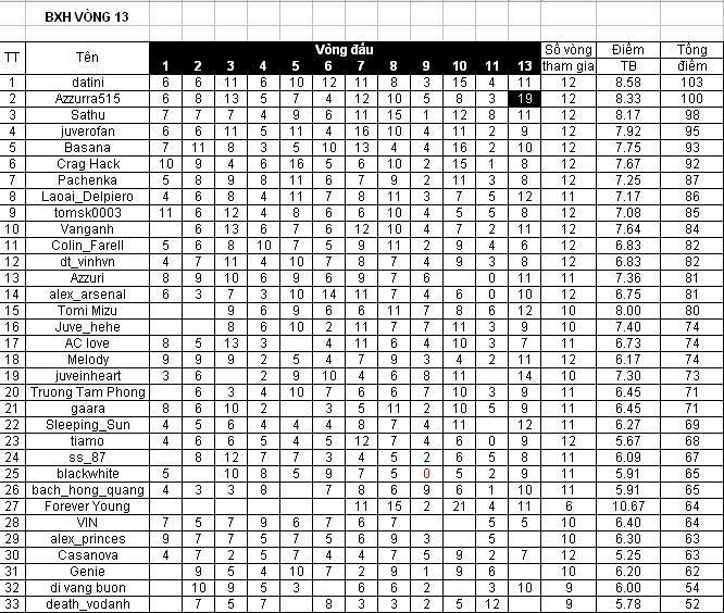 Tính nhầm điểm tôi roài. Vòng 13 tui đoán đúng tỉ số 3 trận Empoli - Torino 0-0, Lazio-parma 1-0 và Udenese-Siena 2-0 và 5 trận khác đoán đúng thắng thua. Như thế phải đc 9+ 5+ 2(điểm thưởng)= 16 điểm chứ.