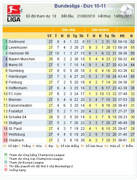 Bảng xếp hạng sau vòng 27 Bundesliga:
